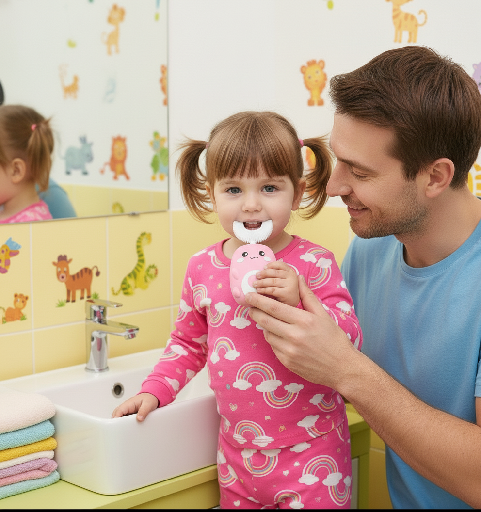 Answer 1: This toothbrush is designed with a unique U-shaped structure that fits snugly around children's teeth and gums, ensuring effective cleaning. Its soft silicone bristles are gentle on sensitive gums, making it ideal for kids. Plus, the engaging design turns brushing into a fun experience, promoting good oral hygiene habits without the usual struggles.